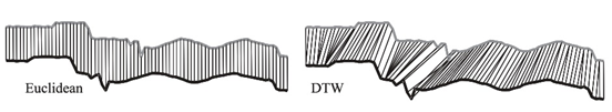 | 동적 시간 왜곡(Dynamic Time Warping)? 속도가 다른 2개의 값이 들어올 때, 유사성을 측정하는 알고리즘. 거리값의 계산을 통해 유사도를 확인한다. 일반적으로 거리값의 계산에는 유클리드 거리 계산법을 이용하는데, 유클리드 거리 계산 방식은 같은 시점의 거리를 계산하기 때문에 속도가 반영되지 않는다. 동일인의 목소리 혹은 걸음거리라고 할지라도 속도가 다르거나, 시작점이 다르면 다르게 인식한다는 말이 된다. 이를 보완한 것이 동적 시간 왜곡 방식이며, 유클리드 방식과는 다르게 거리가 가장 짧은 시점(유사도가 높은 시점)을 찾아 매핑하게 된다. ![]() |