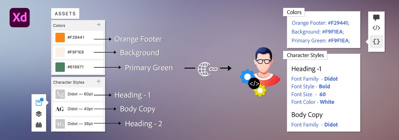 디자인 토큰은 디자이너와 개발자가 XD를 통해 함께 작업할 수 있는 새로운 방법입니다. 이제 에셋 패널에서 색상과 문자 스타일에 이름을 지정할 수 있고, 이러한 색상과 문자 스타일은 개발자가 다운로드 가능한 CSS 파일로 자동 게시됩니다. 개발자는 코드에서 이 CSS 파일을 참조할 수 있고, 디자인의 스타일을 변경하면 수동으로 코드를 업데이트하지 않고도 업데이트된 CSS를 간단하게 이용할 수 있습니다.